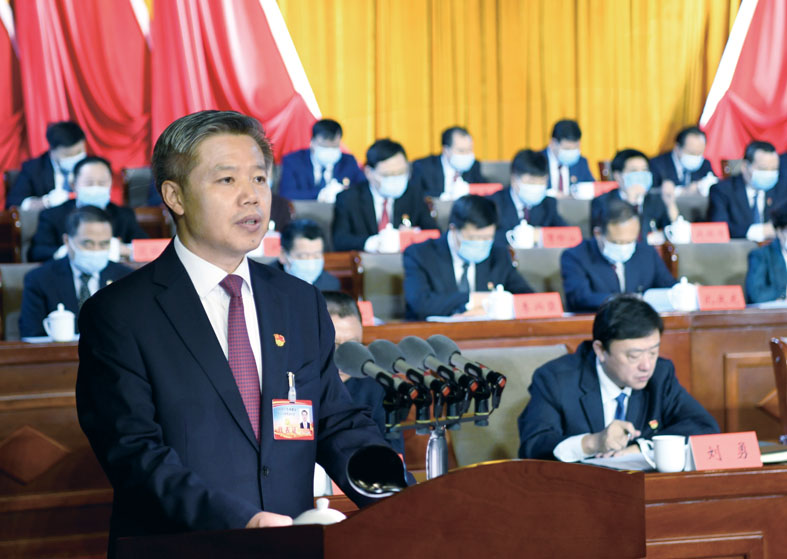 董曉宇代表中共承德市第十四屆委員會(huì)向大會(huì)作報(bào)告。本網(wǎng)記者 陳琦嘉 王立群 攝