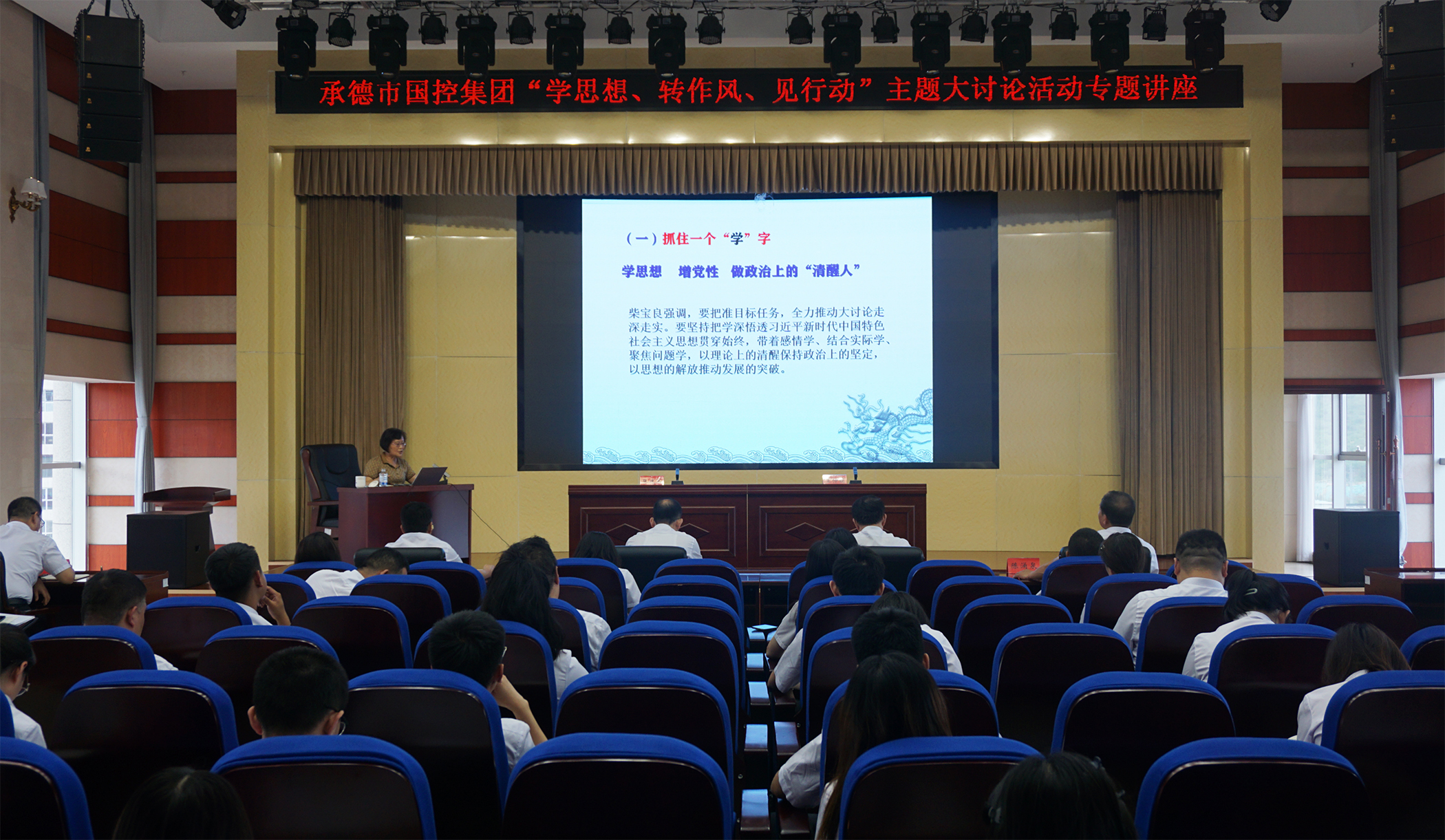2023年7月6日,為深入學(xué)習(xí)貫徹習(xí)近平總書記關(guān)于堅(jiān)持不懈抓好作風(fēng)建設(shè)的重要論述,落實(shí)市委市政府關(guān)于在全市開展“學(xué)思想、轉(zhuǎn)作風(fēng)、見行動”主題大討論活動精神,市國控集團(tuán)邀請承德市委黨校黨史黨建教研室主任王仲娟教授,開展了“學(xué)思想、轉(zhuǎn)作風(fēng)、見行動”主題大討論活動專題講座,市國控集團(tuán)領(lǐng)導(dǎo)班子、集團(tuán)本部全體員工、實(shí)際控制子公司中層以上負(fù)責(zé)同志及黨員員工參加講座。