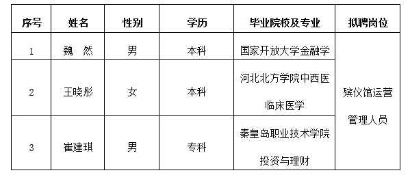 因公司發(fā)展需要,承德市國瑞置業(yè)有限公司委托第三方機(jī)構(gòu)面向社會公開招聘殯儀館運營管理人員3名?,F(xiàn)對擬錄用人員信息進(jìn)行公示,公示期間如有異議,可通過電話、信函等方式反映,反映意見請署真實姓名。