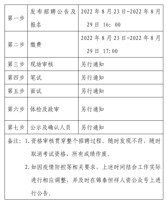 ?2022年8月23日-2022年8月29日 16:00在錦泰恒祥人資官網(wǎng)(www.jthxhr.com)、“錦泰恒祥人資”微信公眾號(hào)、“國(guó)控集團(tuán)”官方網(wǎng)站(m.drbl.com.cn)及上級(jí)部門(mén)要求的相關(guān)網(wǎng)站等發(fā)布招聘公告。