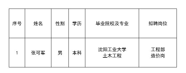 因公司發(fā)展需要,承德市國越房地產開發(fā)有限公司委托第三方機構面向社會公開工程部造價崗員工1名?,F(xiàn)對擬錄用人員信息進行公示,公示期間如有異議,可通過電話、信函等方式反映,反映意見請署真實姓名。