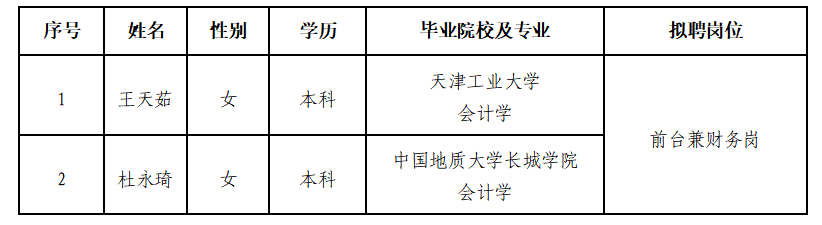 因公司發(fā)展需要,承德市建設投資有限責任公司委托第三方機構面向社會公開招聘前臺兼財務崗員工。現對擬錄用人員信息進行公示,公示期間如有異議,可通過電話、信函等方式反映,反映意見請署真實姓名。