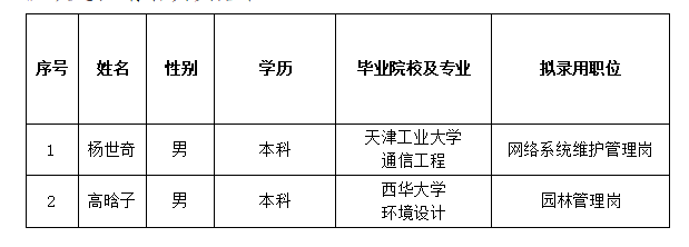 根據(jù)2023年度承德市國瑞置業(yè)有限責(zé)任公司公開招聘工作人員的相關(guān)要求,經(jīng)過筆試、面試、體檢和考察等程序,確定楊世奇、高晗子2名同志為承德市國瑞置業(yè)有限責(zé)任公司擬錄用工作人員,現(xiàn)予以公示?,F(xiàn)對(duì)擬錄用人員信息進(jìn)行公示,公示期間如有異議,可通過電話、信函等方式反映,反映意見請(qǐng)署真實(shí)姓名。