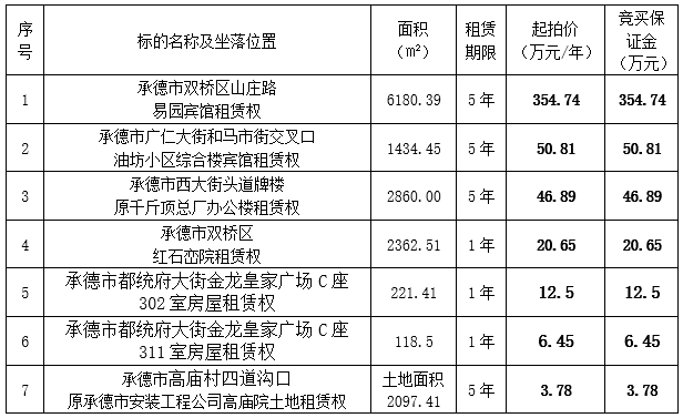 我集團(tuán)全資子公司承德市國控資產(chǎn)運(yùn)營有限公司、承德市國瑞物業(yè)管理有限公司委托河北福成拍賣有限公司,定于2020年1月21日上午9時(shí)在承德市雙橋區(qū)武烈路6號紫御國際假日酒店會(huì)議室公開拍賣下列標(biāo)的,現(xiàn)將有關(guān)事項(xiàng)公告如下: