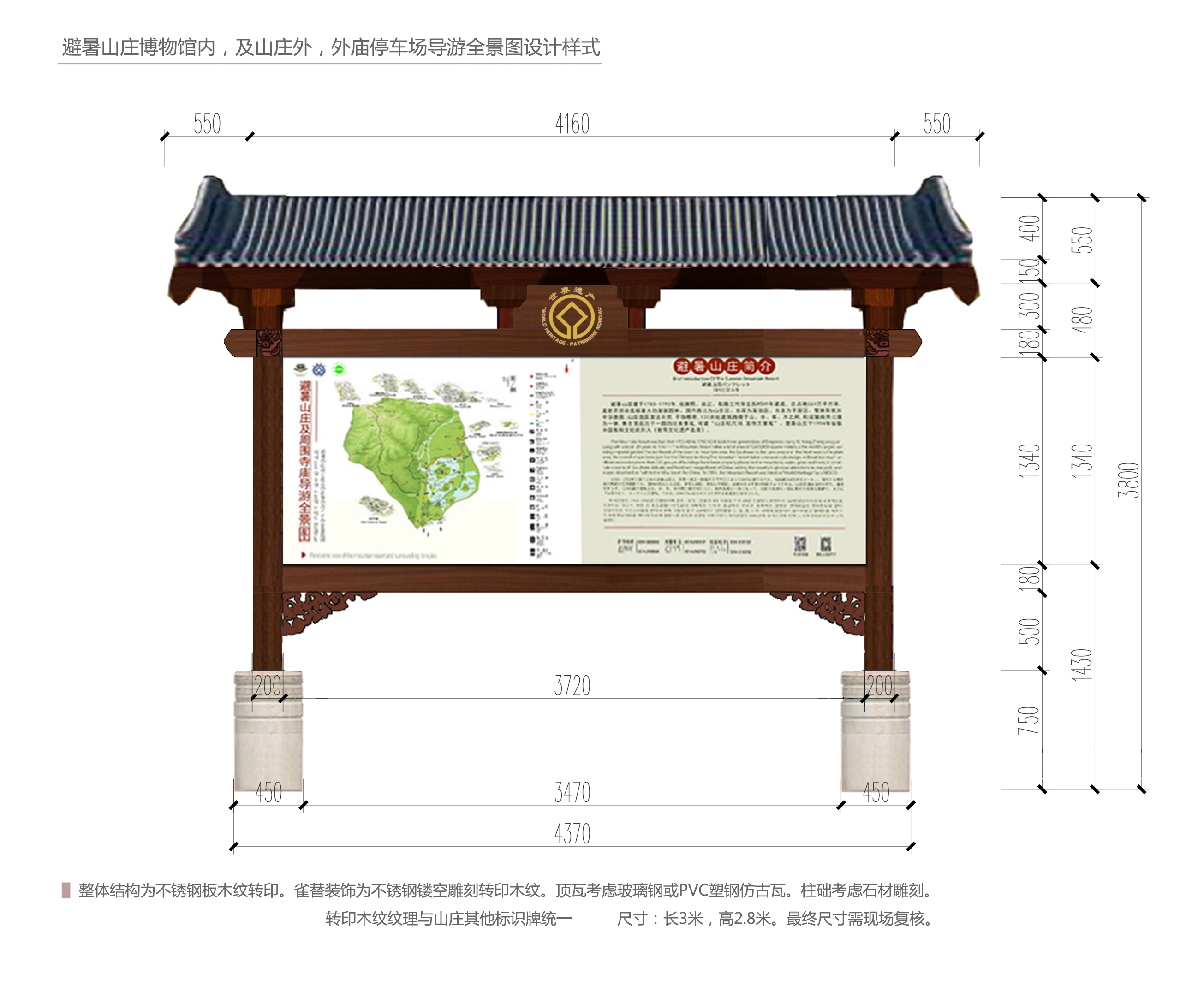 按照承德市人民政府辦公室印發(fā)的《避暑山莊及周圍寺廟景區(qū)整改提升專項(xiàng)工作方案》要求,在避暑山莊及周圍寺廟外5個(gè)停車場內(nèi),各設(shè)置景區(qū)導(dǎo)游全景圖1塊,由我公司邀請有資質(zhì)的單位進(jìn)行制作和施工,現(xiàn)將有關(guān)事項(xiàng)通知如下: